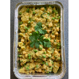 2/3 portions +-740g. This lightly spiced fragrant dish has sweet potato chunks with fresh ginger, garlic and a touch of chilli simmered together with chickpeas in a coconut broth with a dash of lemon.